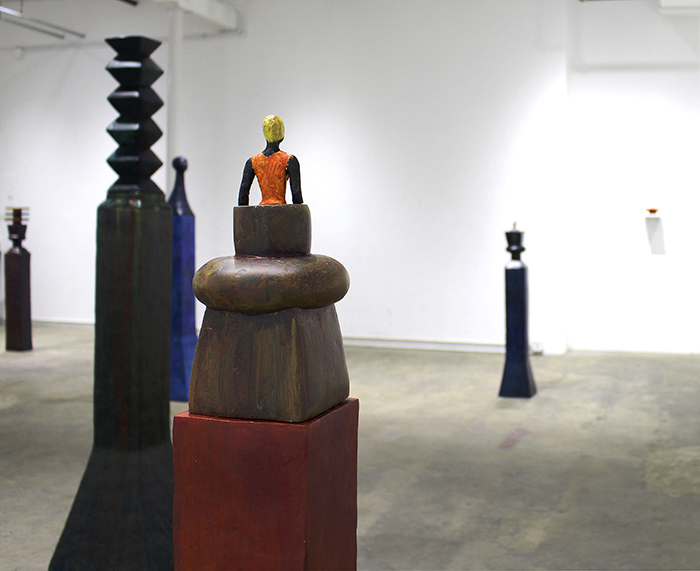 “Rossmer…seeks out the tension between stability and mobility, (imbuing the) lower, columnar parts …with tonal energy, soaking them in paint. It’s as if they’re warming up, still solid but a launching pad and incubator for what sits on top of them. Pieces such as this… turn the staid forms of traditional sculptural presentation into something generative, as if traditional structure is an egg on the verge of hatching.”