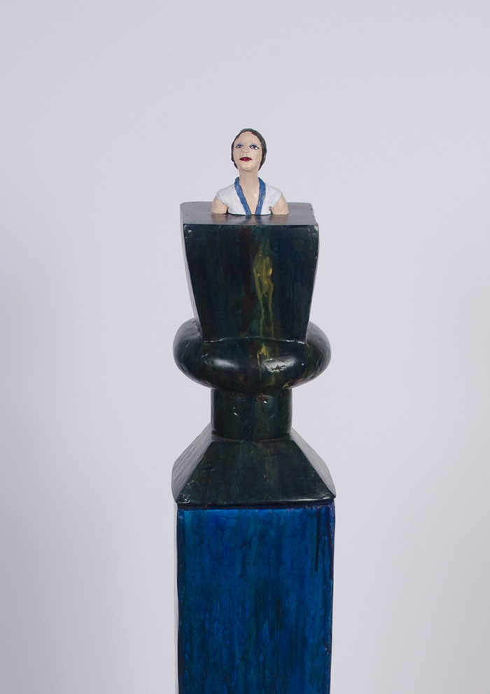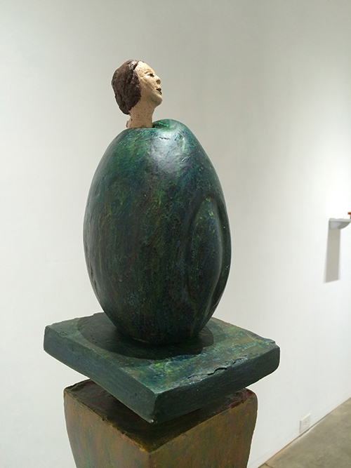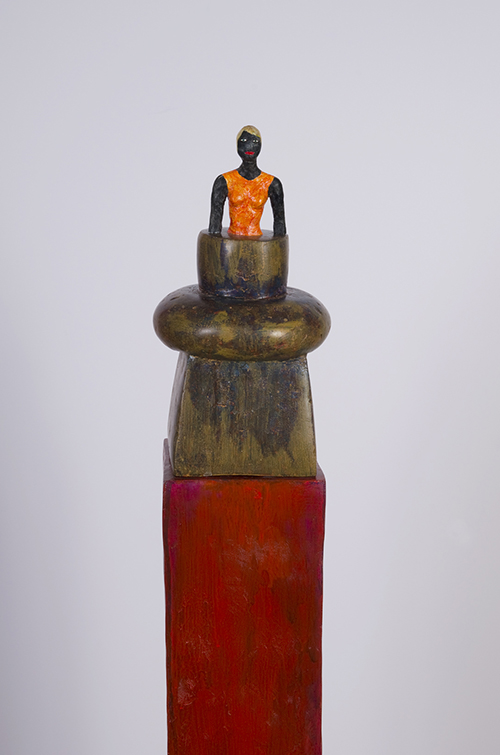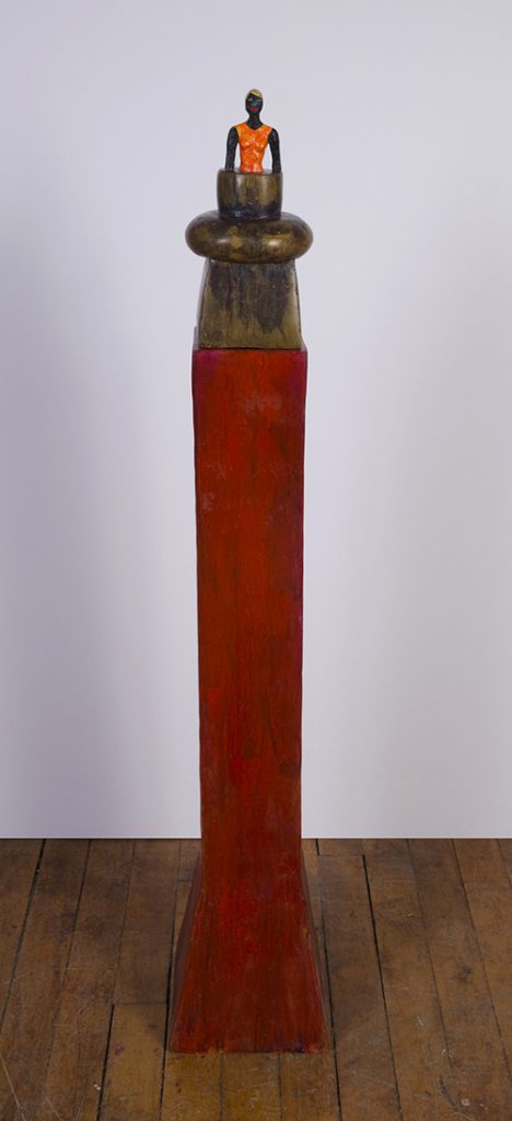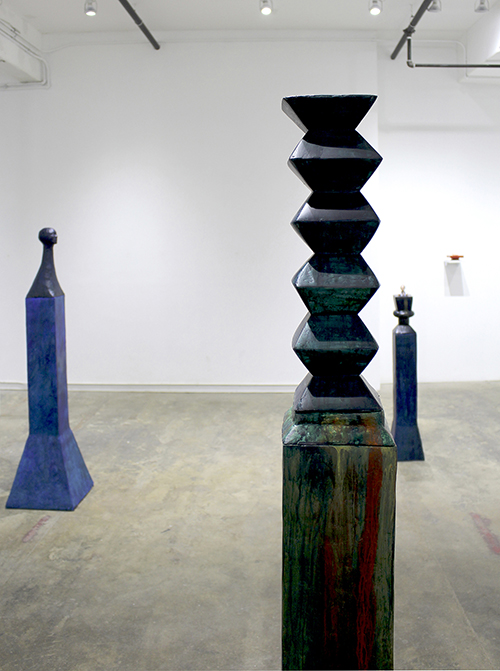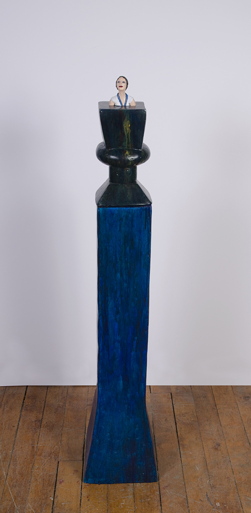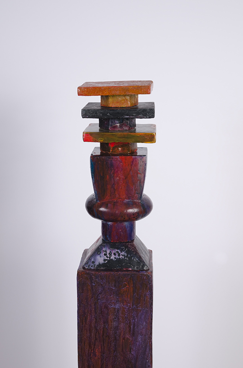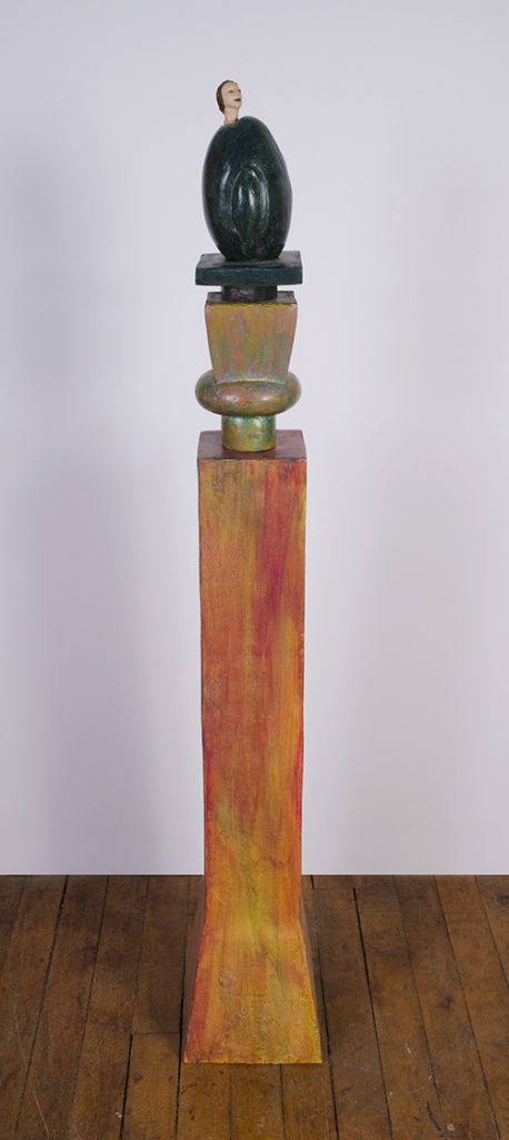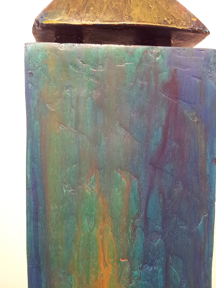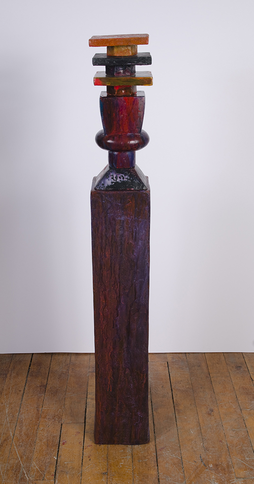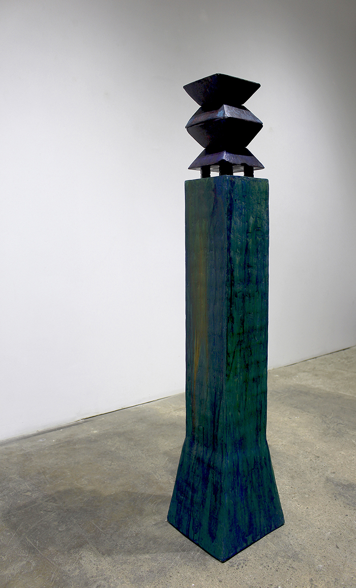 “Rossmer…seeks out the tension between stability and mobility, (imbuing the) lower, columnar parts …with tonal energy, soaking them in paint. It’s as if they’re warming up, still solid but a launching pad and incubator for what sits on top of them. Pieces such as this… turn the staid forms of traditional sculptural presentation into something generative, as if traditional structure is an egg on the verge of hatching.”